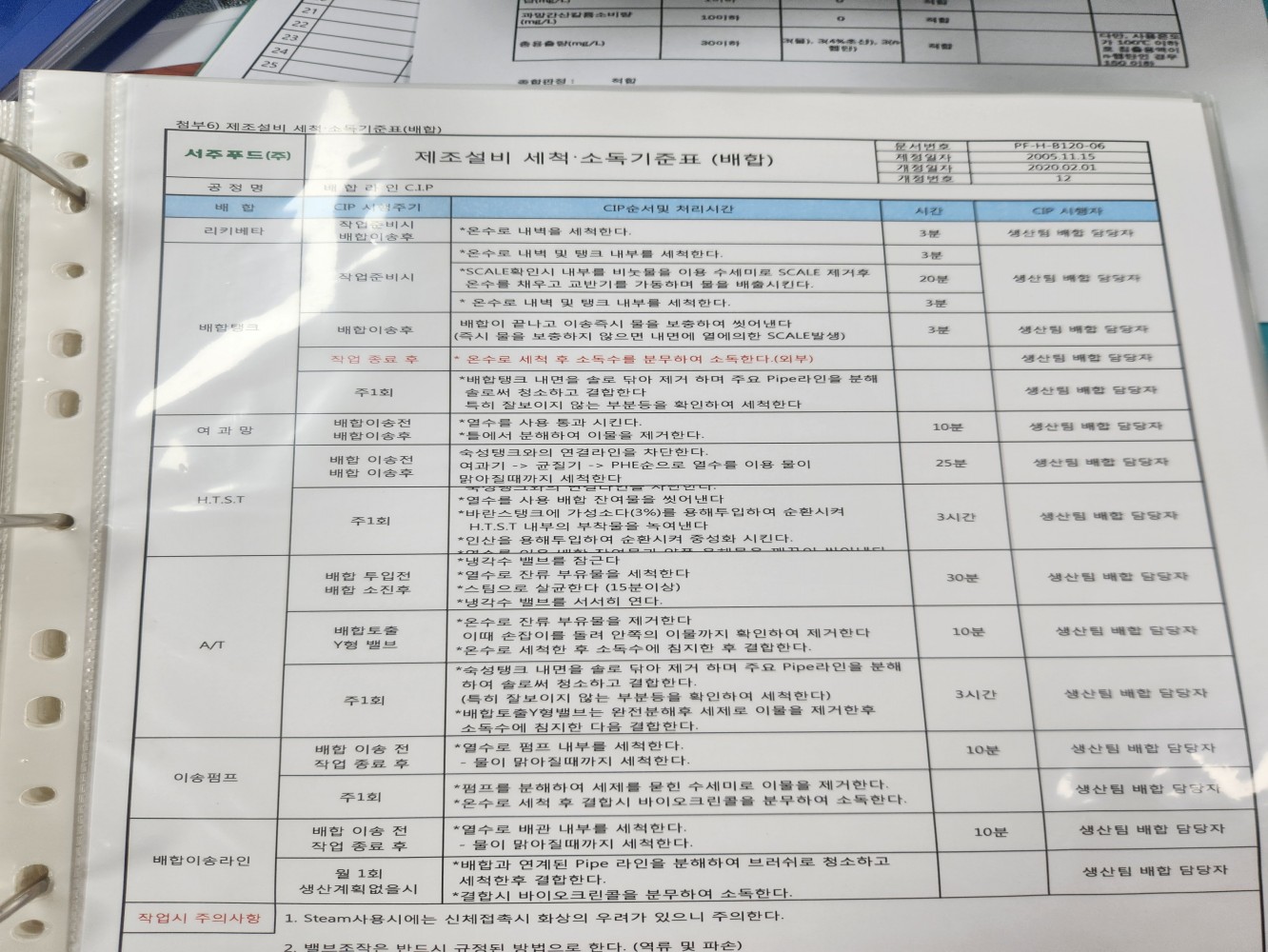 27. 시설 및 설비 등에 대한 세척/소독 관리 기준이 구비되어 있으며, 적절히 운영되는가(CIP 포함)