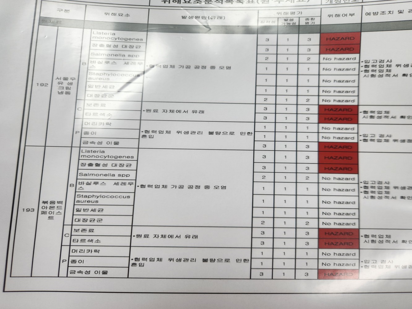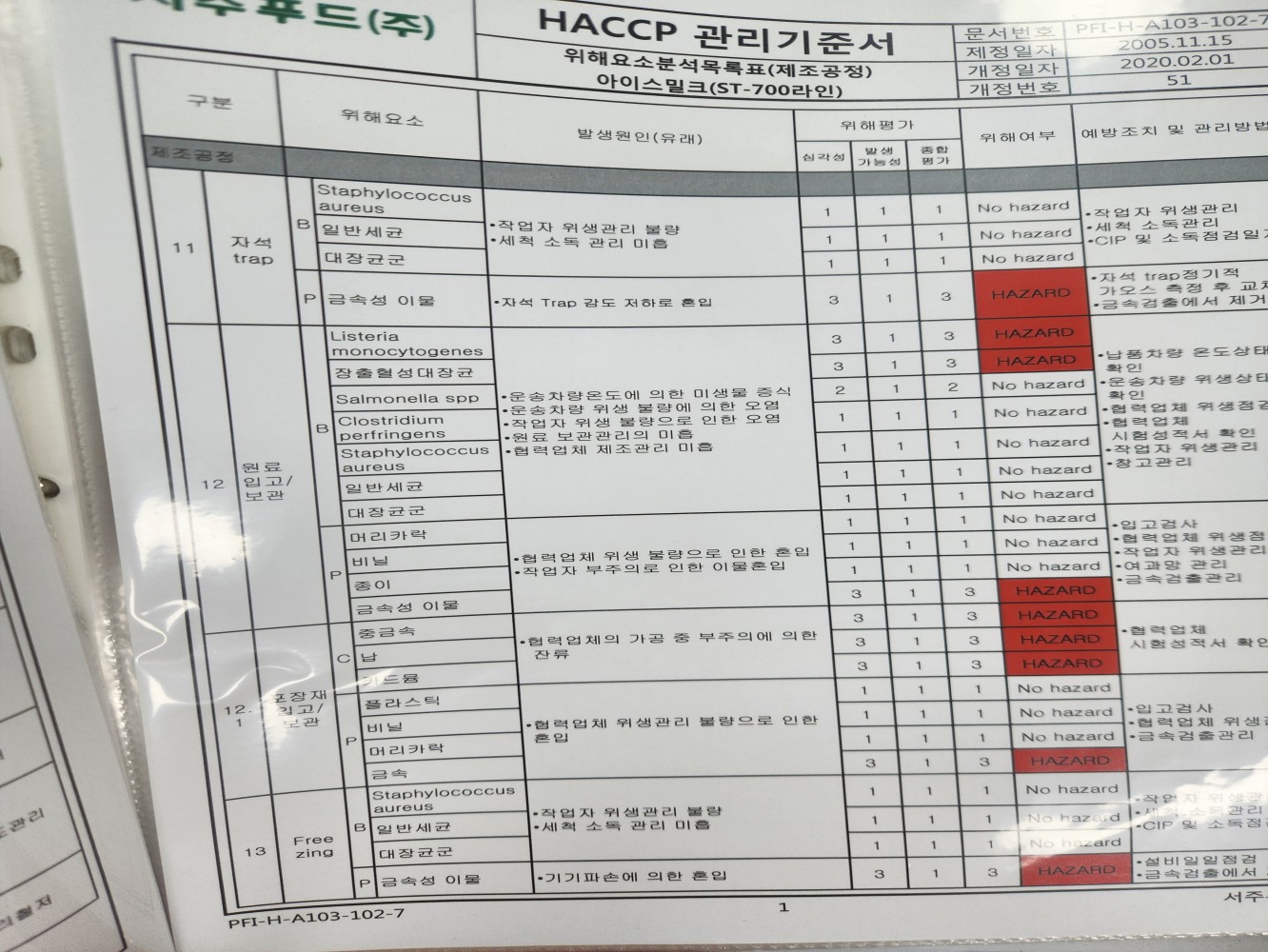 30. 원료별, 공정별 위해요소 분석이 실시되었으며, CCP 결정 및 운영이 적정한가