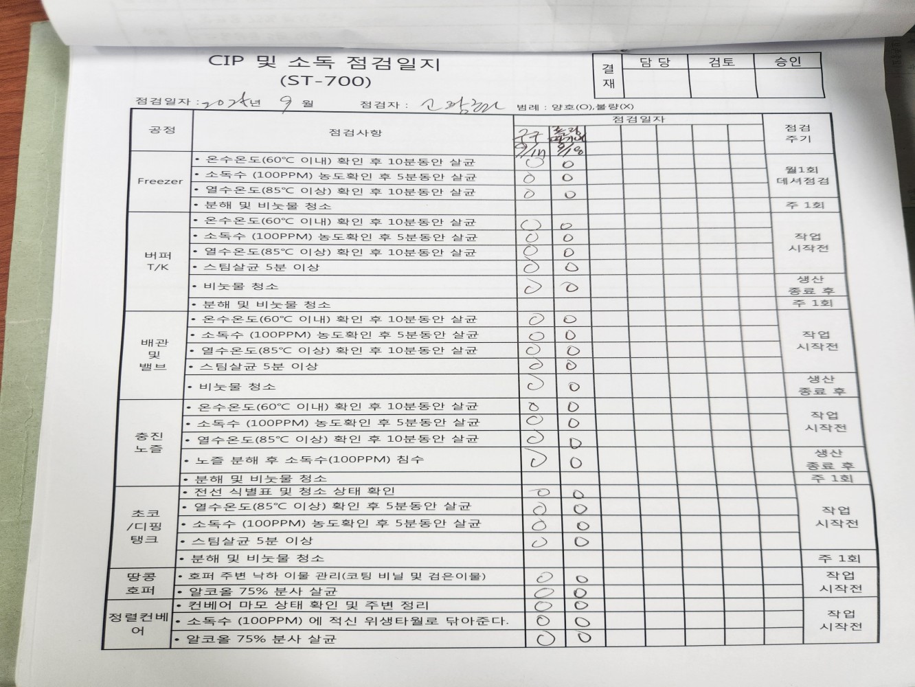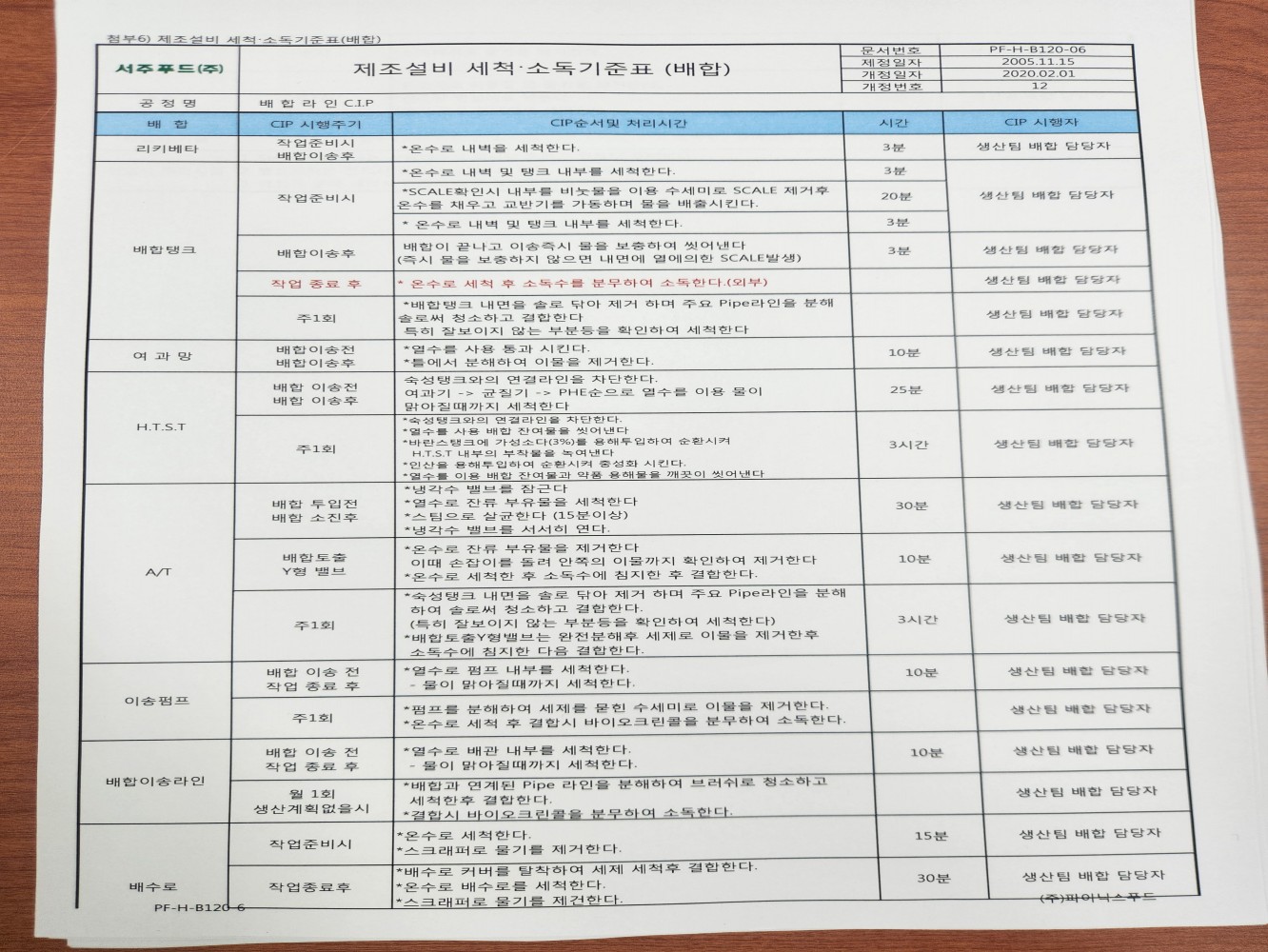 21. 시설 및 설비 등에 대한 세척/소독 관리 기준이 구비되어 있으며, 적절히 운영되는가(CIP 포함)