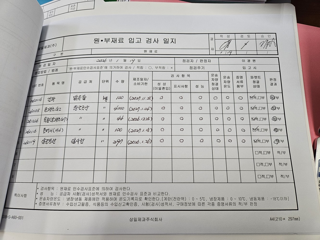 2. 원부재료 및 포장재 입고 검사 및 검수를 실시하고 있는가