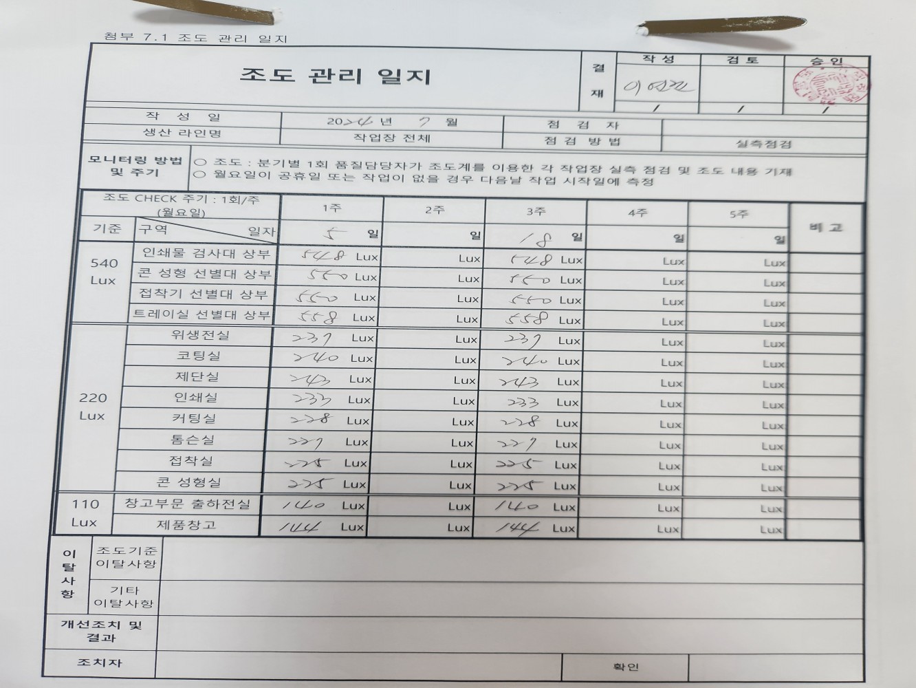 10. 구역별 조도 관리 기준이 구비되어 있으며, 적정 조도가 유지되는가