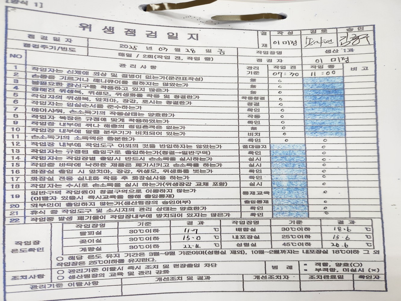 15. 작업 구역별 온/습도 기준이 수립되어 있으며, 적절히 운영되는가