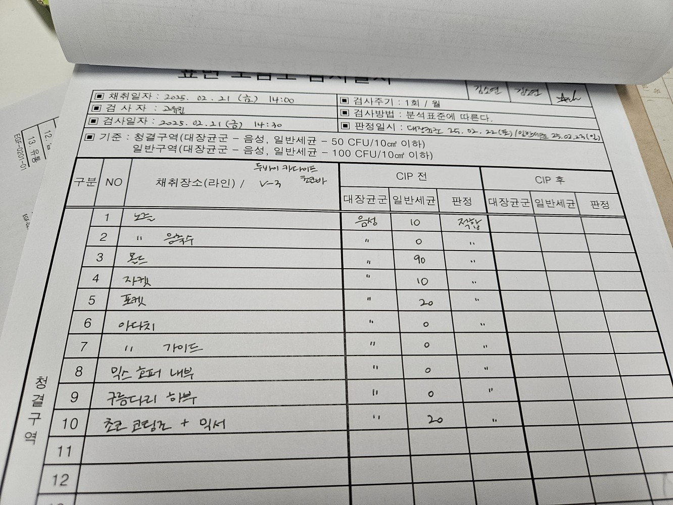 16. 시설 및 설비 등에 대한 세척/소독 관리 기준이 구비되어 있으며, 적절히 운영되는가(CIP 포함)