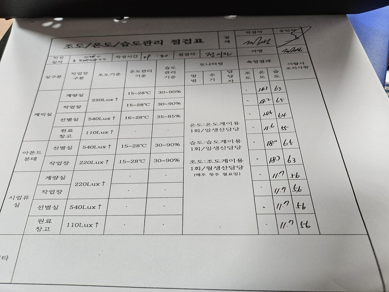 14. 구역별 조도 관리 기준이 구비되어 있으며, 적정 조도가 유지되는가