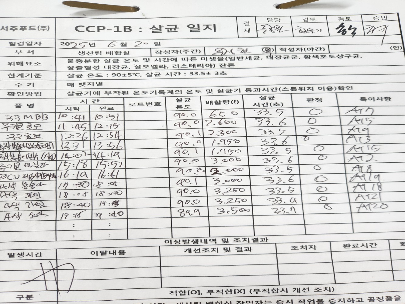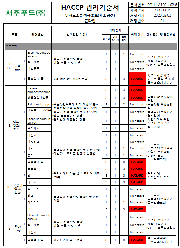 30. 원료별, 공정별 위해요소 분석이 실시되었으며, CCP 결정 및 운영이 적정한가