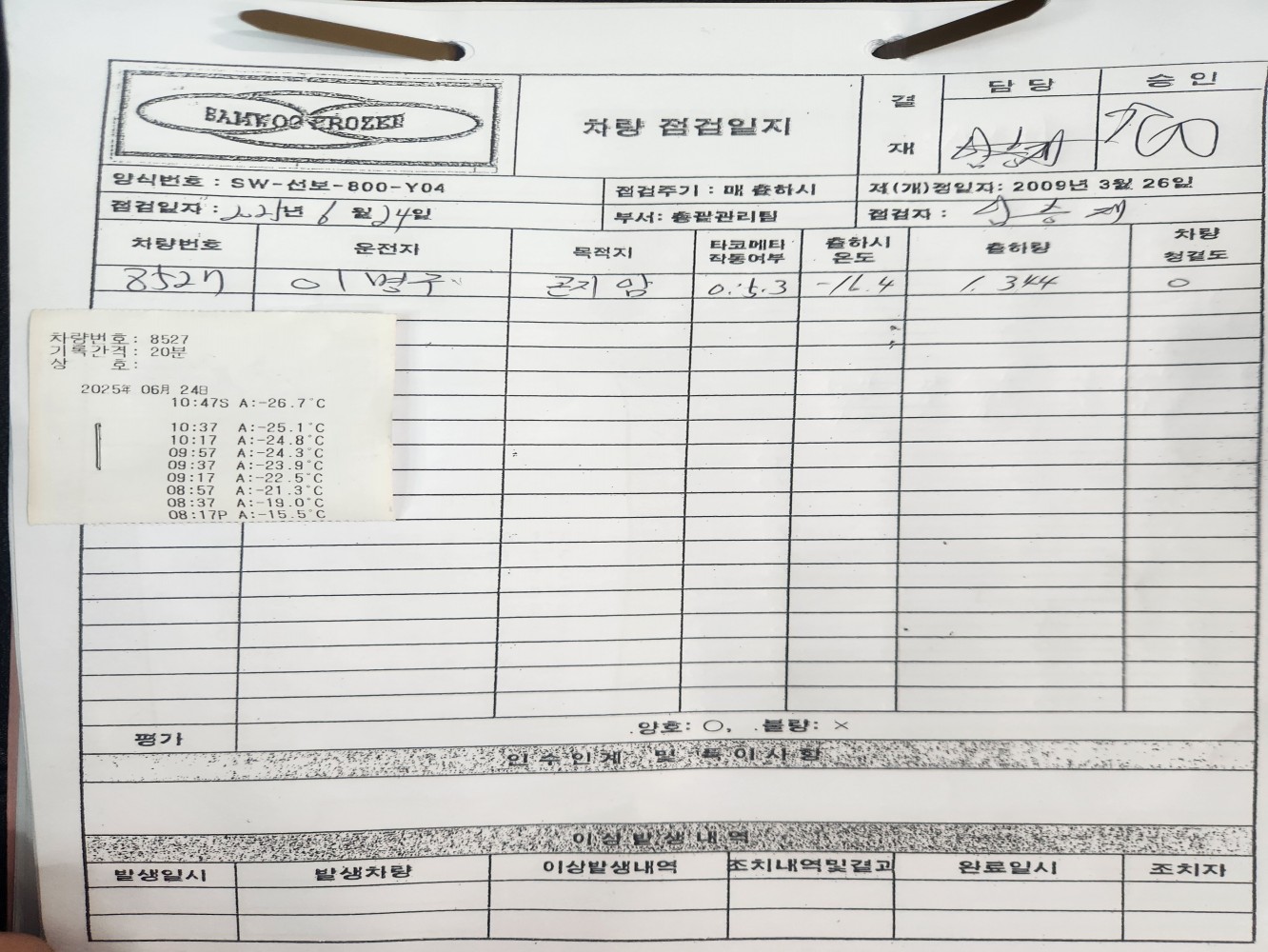 6. 운송 차량은 청결하며, 유통 온도가 관리/기록되고 있는가