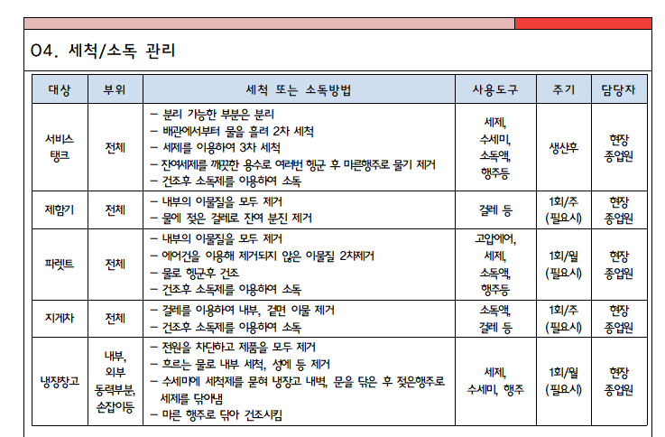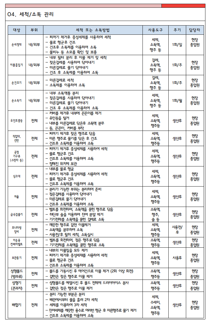 15. 시설 및 설비 등에 대한 세척/소독 관리 기준이 구비되어 있으며, 적절히 운영되는가(CIP 포함)