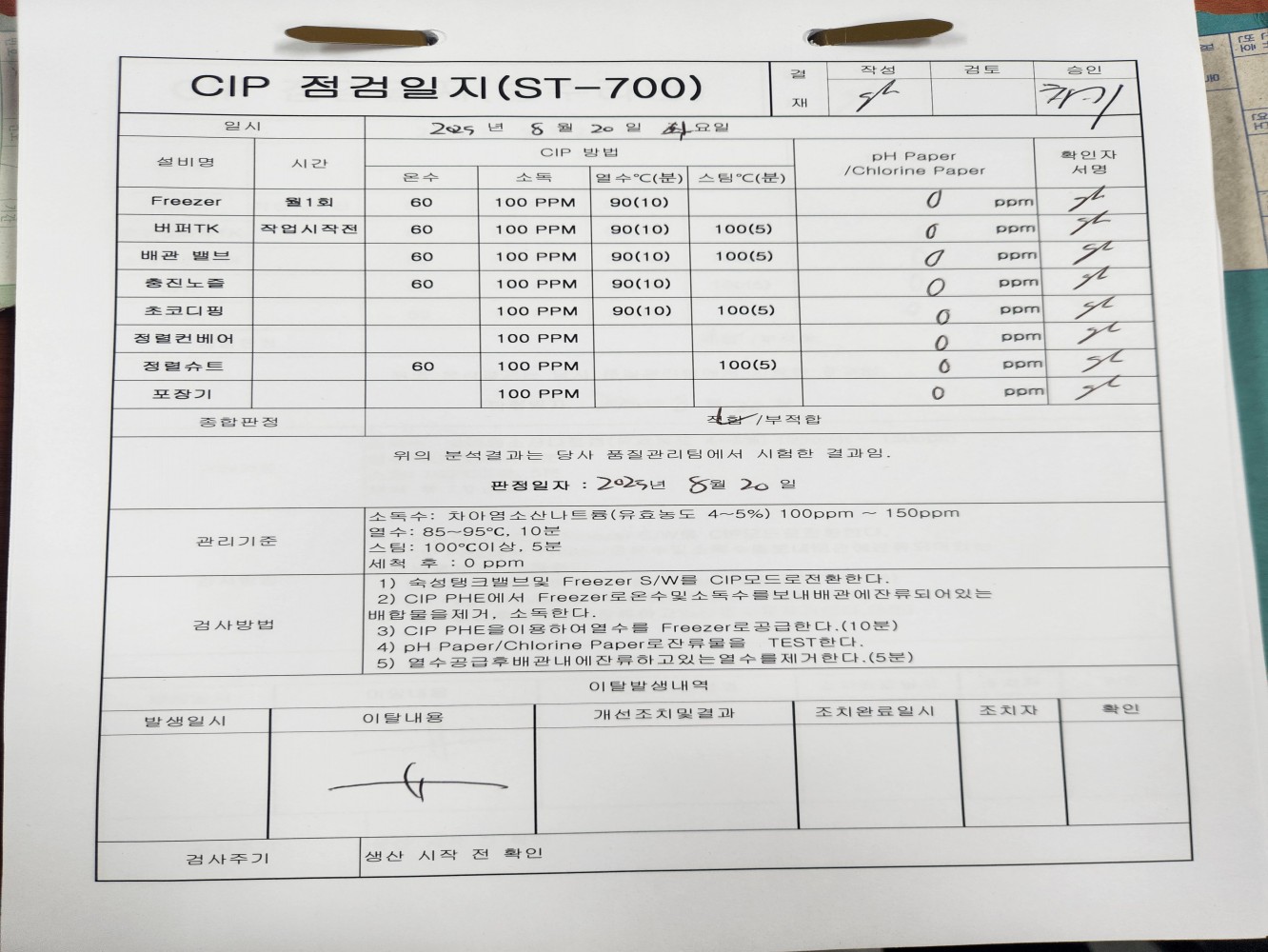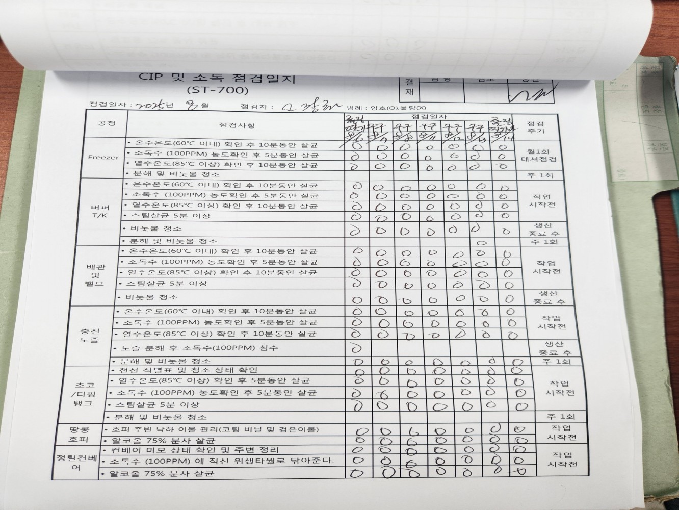23. 시설 및 설비 등에 대한 세척/소독 관리 기준이 구비되어 있으며, 적절히 운영되는가(CIP 포함)