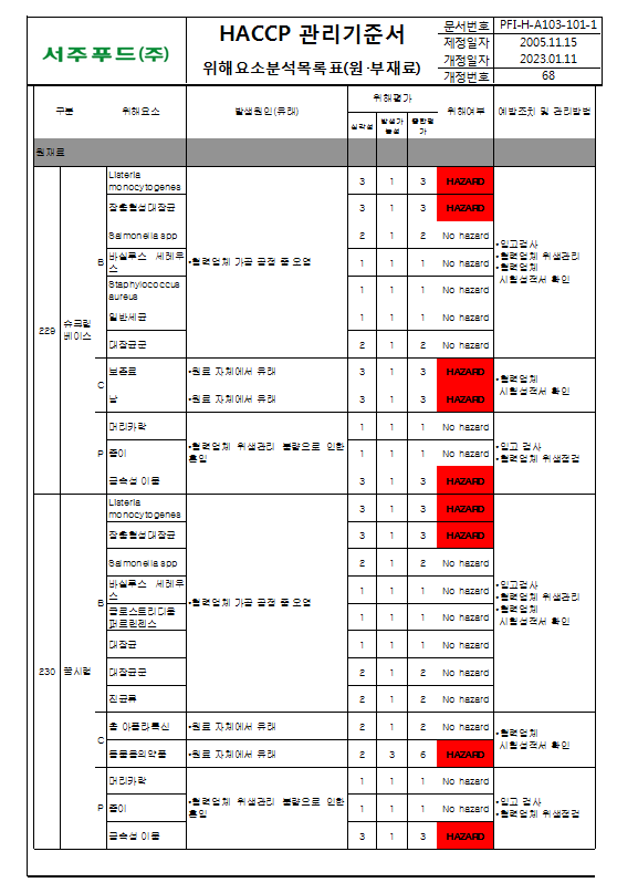 28. 원료별, 공정별 위해요소 분석이 실시되었으며, CCP 결정 및 운영이 적정한가