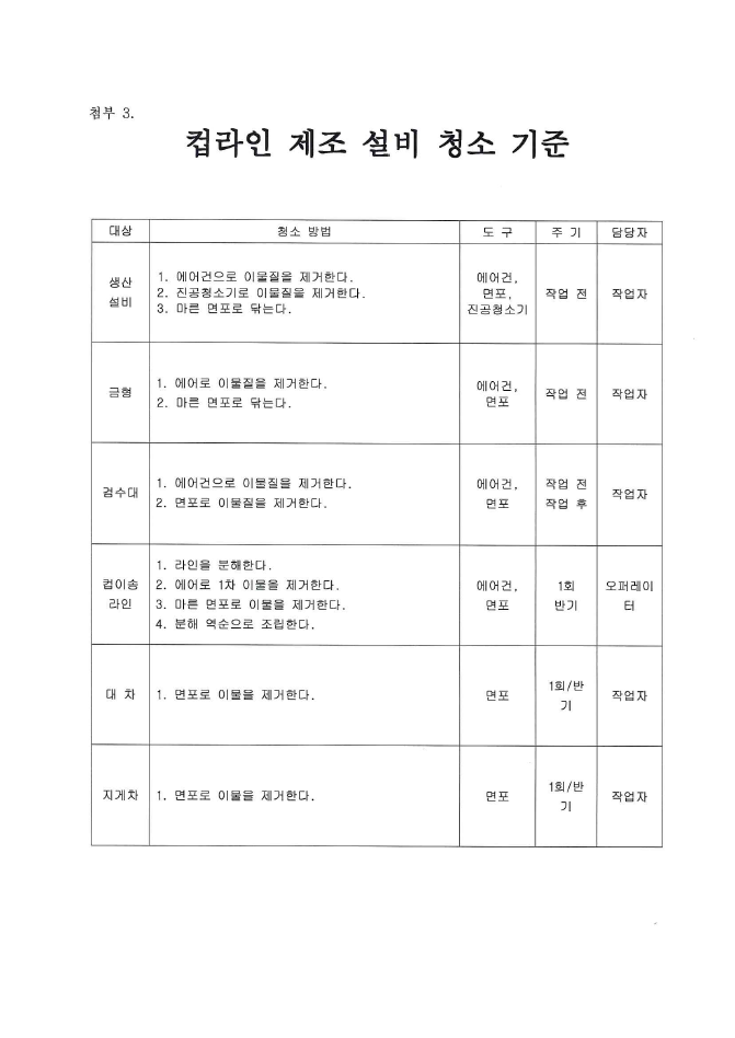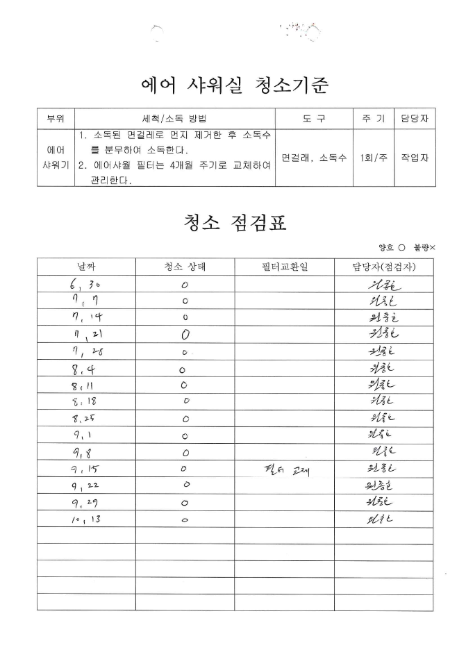 13. 설비는 청결하며, 자체 세척/소독 기준에 따라 관리되고 있는가