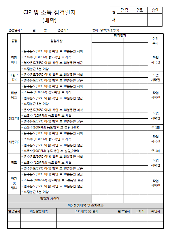 21. 시설 및 설비 등에 대한 세척/소독 관리 기준이 구비되어 있으며, 적절히 운영되는가(CIP 포함)
