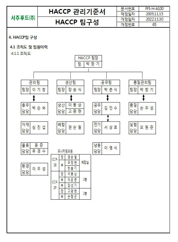24. HACCP팀은 적절히 구성되어 있으며, 최신 버전으로 업데이트되어 있는가