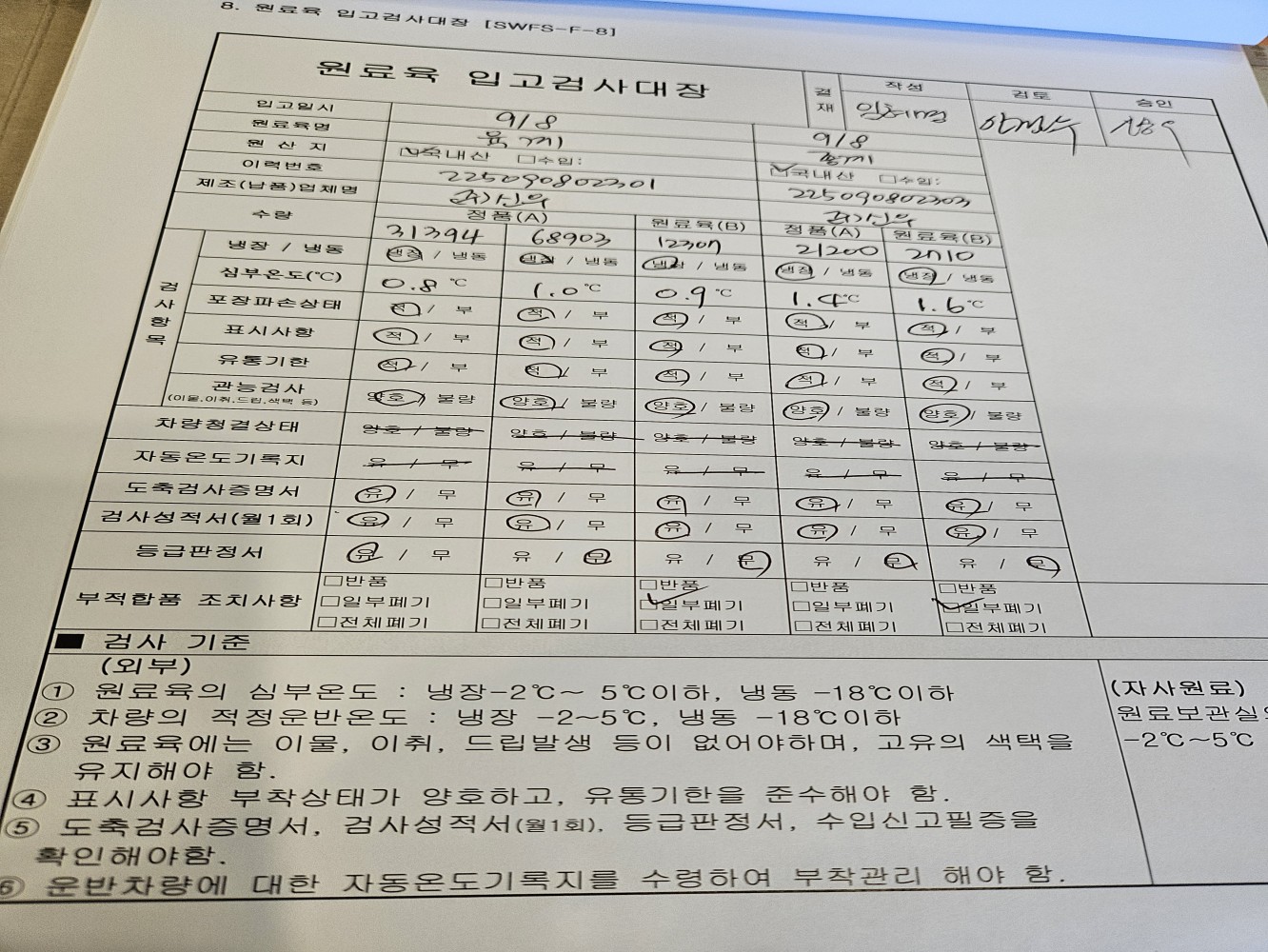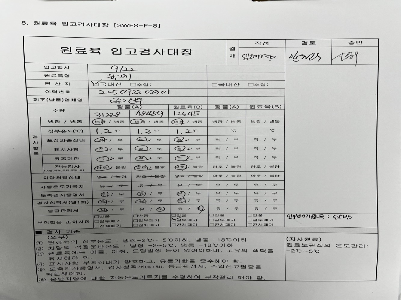 1. 원부재료 및 포장재 입고 검사 및 검수를 실시하고 있는가