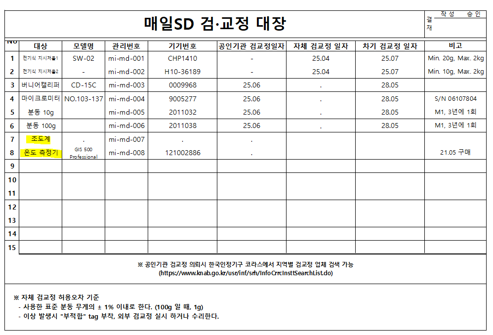 5. 계측 장비는 주기적으로 검교정되며, 관련 기록이 구비되어 있는가