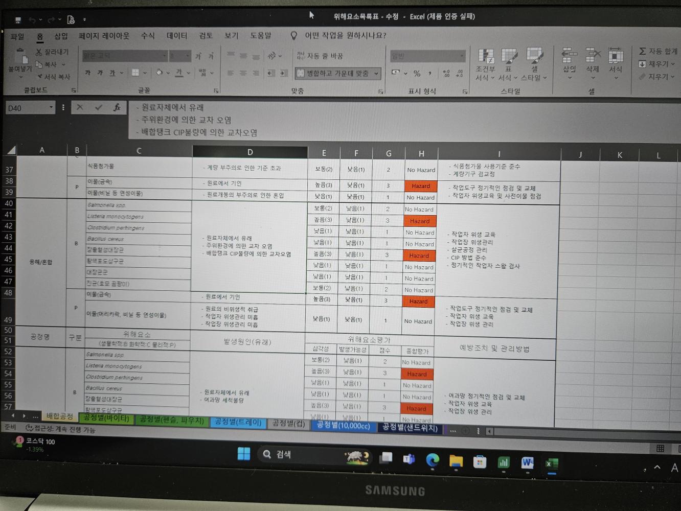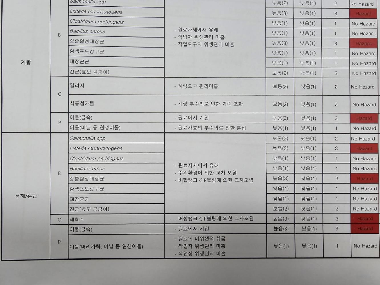 22. 원료별, 공정별 위해요소 분석이 실시되었으며, CCP 결정 및 운영이 적정한가