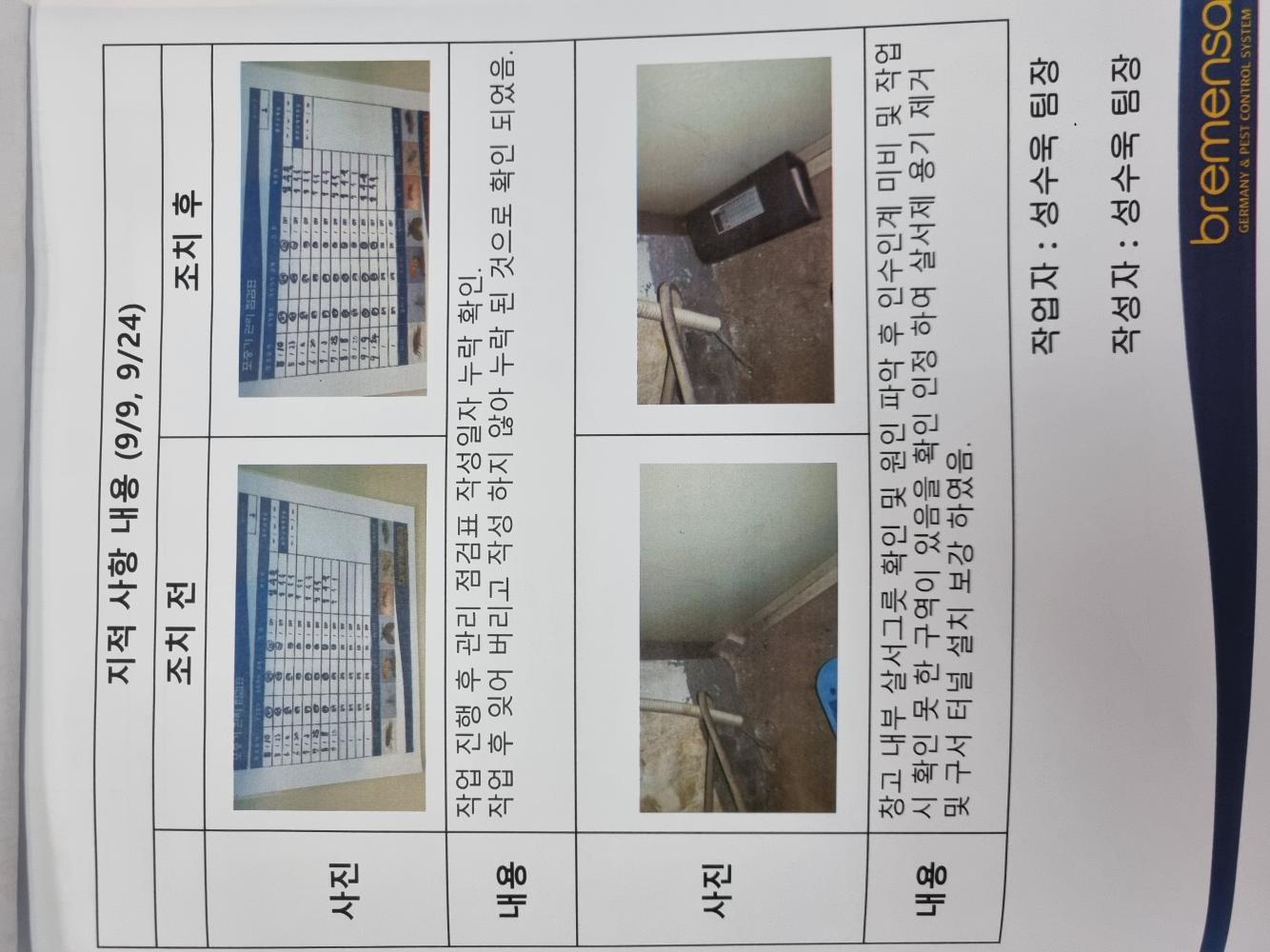 9. 외부 연결 지점 내 이물/해충 제어를 위한 설비가 구비되어 있으며, 작업장 밀폐가 운영되고 있는가